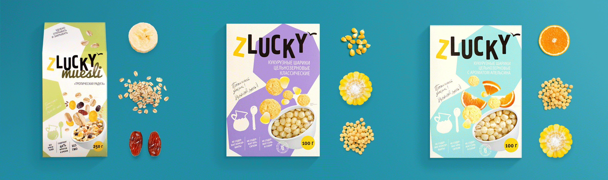 В качестве нейминга было выбрано слово «злаки», выполненное латинским написанием. Благодаря этому приему и цветовому выделению части названия, оно приобрело дополнительную смысловую окраску – каждый, кто выбирает правильный завтрак – счастливчик, ведь его ждет замечательный, удачный день!