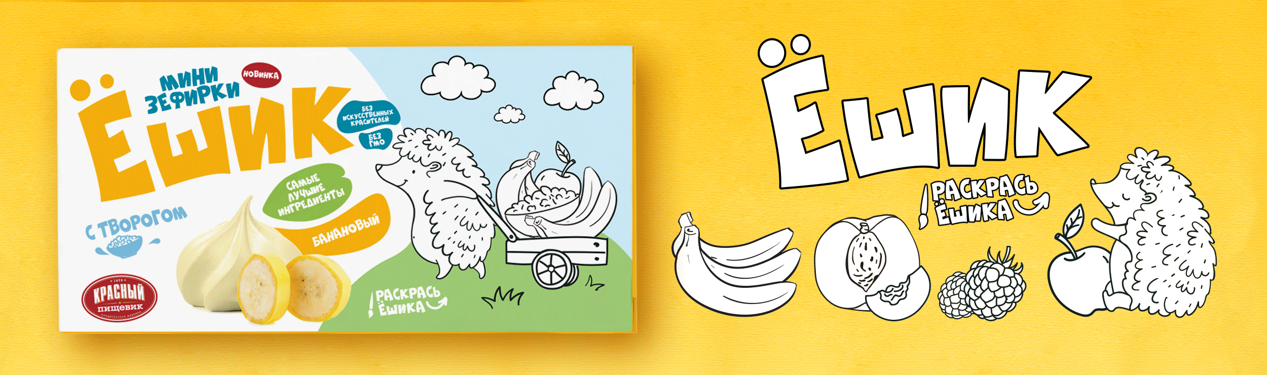 На что могут быть похожи маленькие зефирки со своим красивыми острыми верхушками? На купол воздушного замка, на шапку, на ёжика…. На что угодно! Главное – дать волю фантазии. А уж у кого у кого, а у детей с этим проблем нет. Надо только предоставить им поле для творчества. Поэтому мы решили предложить им стать соавторами в дизайне упаковки и раскрасить нашего милого бренд-персонажа Ёшика! Почему Ёшик? Потому что он шикарный! Каким еще он может быть, когда его раскрашивает ребенок?